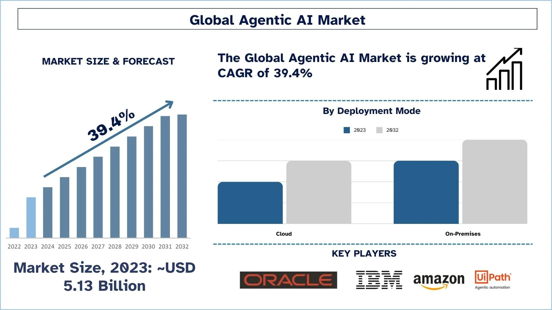 The Global Agentic AI Market was valued at USD 5.13 Billion in 2023 and is expected to grow to a strong CAGR of around 39.4% during the forecast period (2024-2032)
